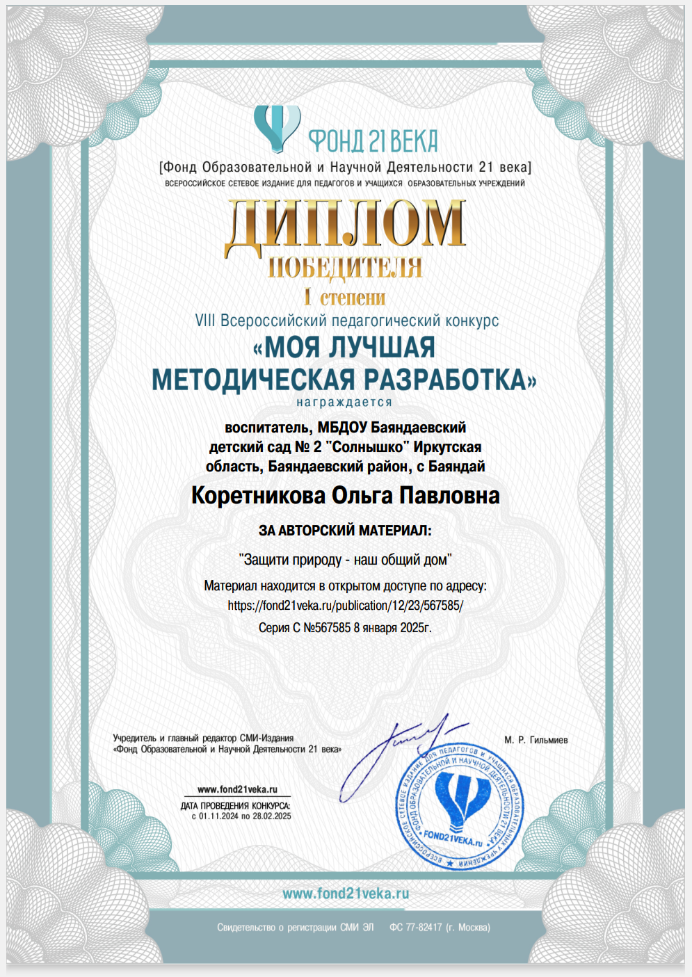 Воспитатели приняли онлайн участие в VIII Всероссийском педагогическом конкурсе "Моя лучшая методическая разработка", который проходит с 1 ноября по 28 февраля 2025г. Организатор конкурса - Всероссийское сетевое издание «Фонд Образовательной и Научной Деятельности 21 века» г.Москва.